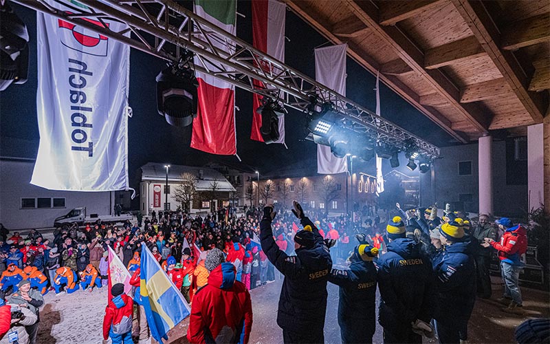 Eröffnungsfeier im Dorfzentrum von Toblach: Team-Presentation & Live-Musik.